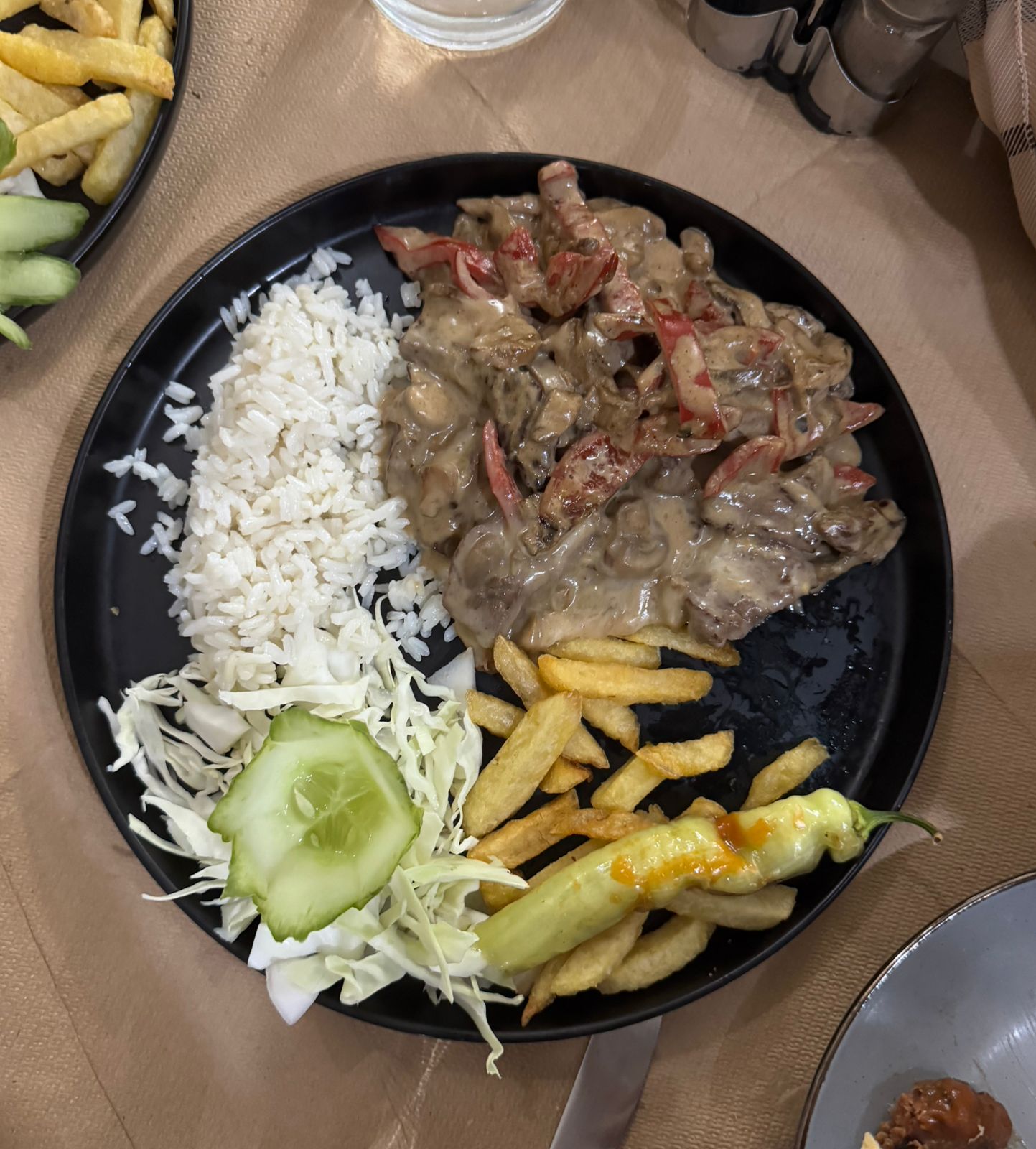 13,00€Μοσχαρίσιο φιλέτο, μανιτάρια, Worchester σως, πιπεριές χρωματιστές, κρέμα γάλακτος.